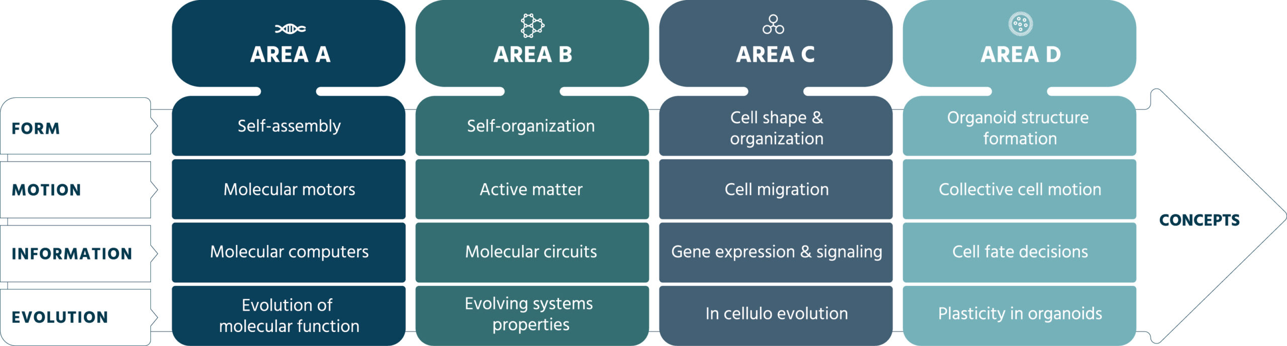 Integrated Research Themes are introduced as a connector structure linking all Research Areas with respect to specific “hallmarks of life” aiming to identify synergies, provide feedback and ideas to the Areas and initiate additional collaborations among them